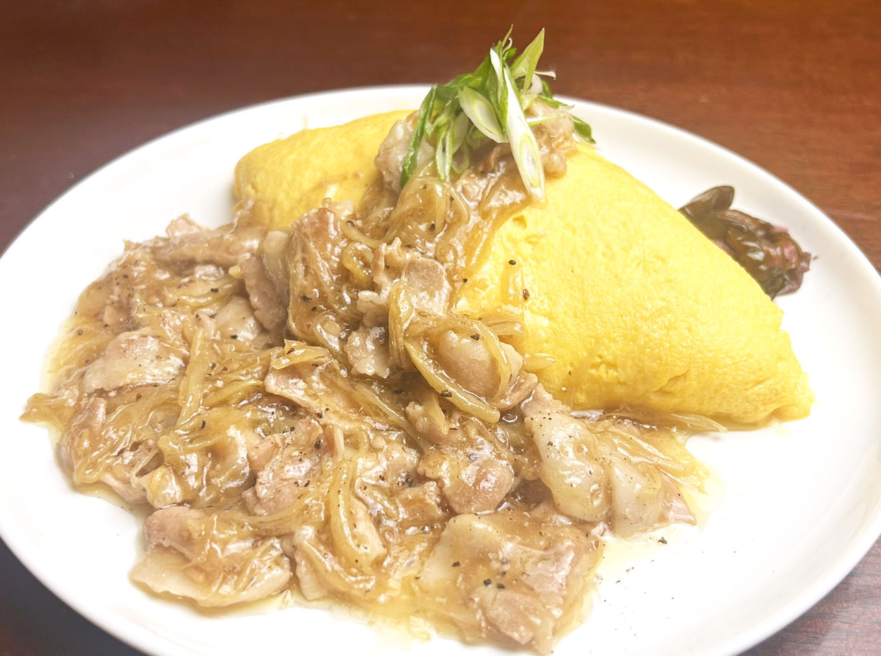 2月の月替りは『千切り生姜の豚生姜あんかけオムライス』 2026/02/04 オムライス 千切り生姜がどっさりはいったビビットな豚生姜あん。 生姜の刺激的な風味と豚バラ肉の旨味が相まって、癖になる味です。 中は麦ご飯です。