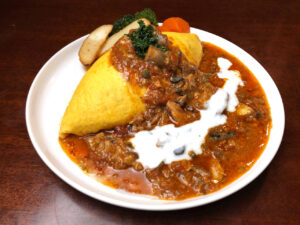 タイの人気料理「ガパオ」をアレンジしたオムライス。具材は鶏もも肉を使用、ナンプラーの異国的な風味が癖になる味です。辛さは控えめ、ホーリーバジルとコブミカンの葉の爽やかな風味が広がります。中は香り豊かなジャスミンライスです…